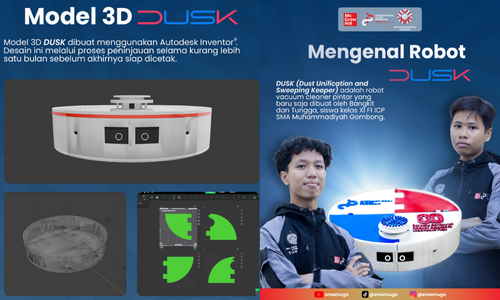 <p><strong>Kenalkan, DUSK!</strong></p><p>Karya inovatif siswa SMA Muhammadiyah Gombong: Dust Unification and Sweeping Keeper (DUSK), robot pembersih otomatis berbasis AI.</p><p>Robot ini dapat berjalan secara otomatis dengan pola zig-zag maupun dikendalikan secara manual melalui webserver.</p><p>Semoga hadirnya DUSK menjadi inspirasi generasi muda untuk terus berinovasi, berkreasi, dan membawa kemajuan teknologi di masa depan.</p><p> </p>